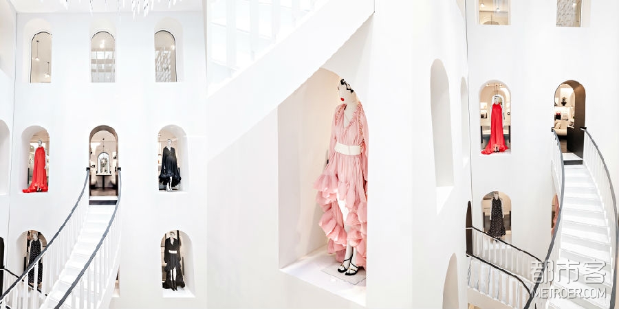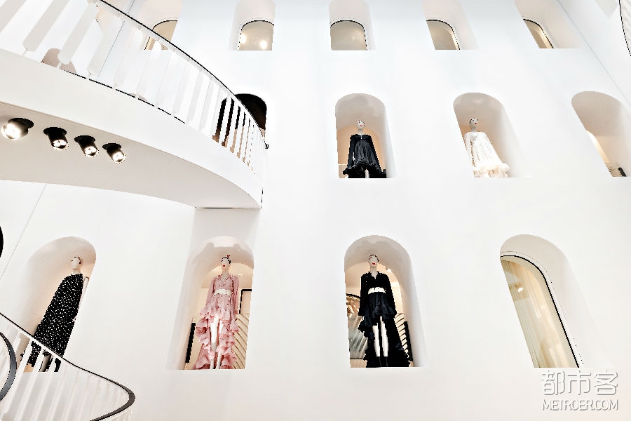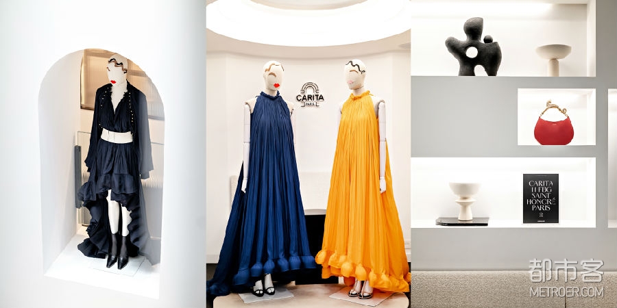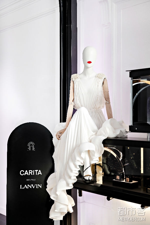 时至今日,这种缘分依然长存。值此巴黎时装周之际,双方亦希望携手举办一场CARITA X LANVIN后现代高定造型展,延续这段旷世友谊。以此次活动为机缘,CARITA品牌再次发出邀请,诚邀宾客步入其焕变圣殿。在这里,随处可见简洁利落的线条和圆润的轮廓,浪漫风格令人沉醉,独属于女性的柔和气质弥漫四溢。甫一踏入中庭,宾客的目光即被壮观的焕变之梯所吸引;梯级盘旋向上,通往CARITA焕变圣殿的经典拱门。拾级而上,数件高定礼服呈现在眼前;大胆诱人的标志性褶边,灵动舒展,宽畅宜人,演绎淡然大气的优雅风范。信步往前,礼裙琳琅满目,蕴藏着一脉相承的盎然生机。圣殿内微风缕缕,裙摆随风飘扬,活色生香,映衬福宝大道11号的璀璨奢华光芒,十分引人注目。店内装潢选用黑白与奶油底色,点缀明艳色彩,营造出令人目眩神迷的难忘体验。