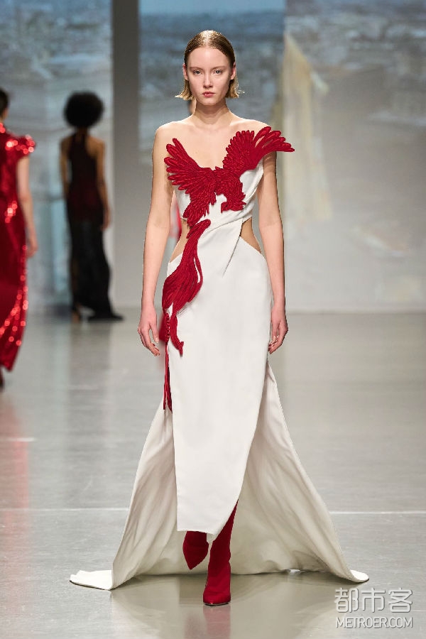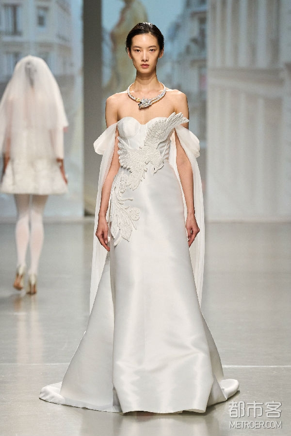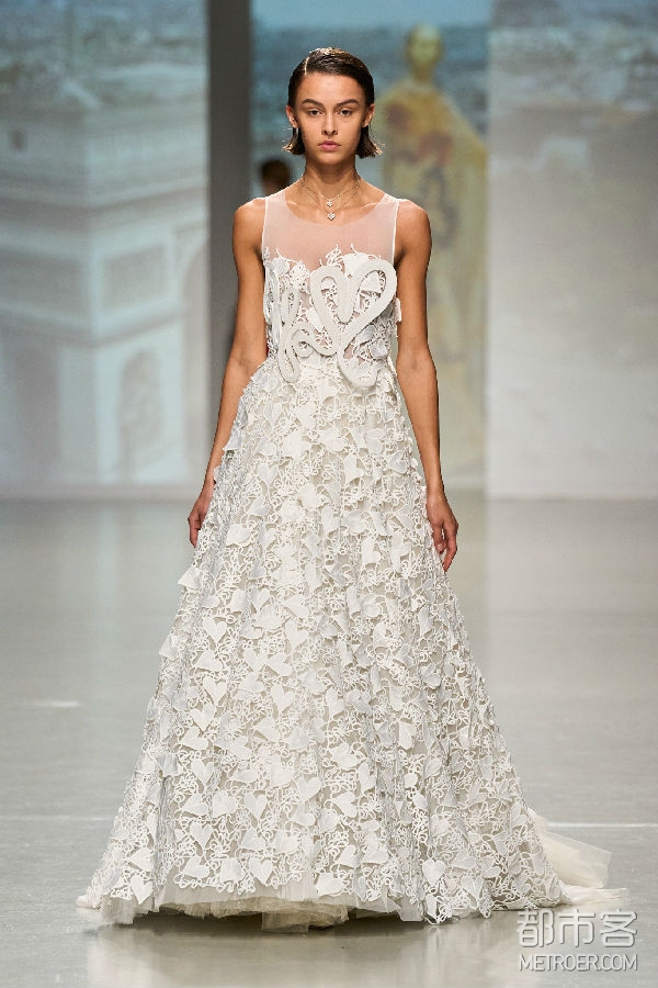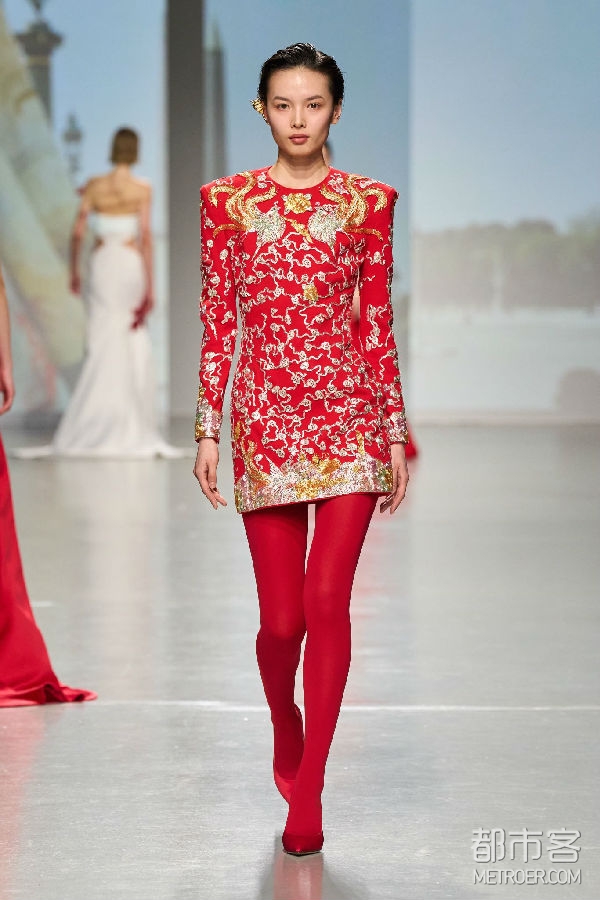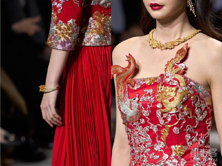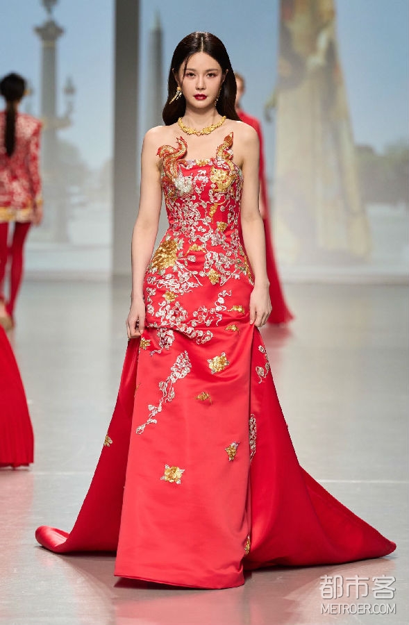 巴黎被视为全球时尚之都,这个浪漫的城市承载着包括设计师Vivienne Tam在内的无数人的个人情感记忆。VIVIENNE TAM品牌2024秋冬系列时装秀是设计师在巴黎时装周的首秀,是品牌成立30周年的庆祝,也是首次与DR携手以中国婚嫁文化这一独特视角共同推动中法文化交流、文明互鉴,庆贺中法两国建交60周年。在本次联名合作系列中,DR x VIVIENNE TAM当代中国婚嫁系列包括以龙系列、金镶钻系列、以及钻石系列,产品涵盖婚戒、耳饰、项链、手镯、手链等,满足年轻一代消费者对中国传统婚嫁配饰与时尚当代审美的双重需求。神话般的龙,作为2024农历新年的生肖,是力量和转变的象征,Vivienne Tam设计的龙图案翱翔在中国丰富的文化遗产和法国浪漫优雅之间,作为爱的桥梁。该合作系列既有对中国传统婚嫁文化的尊重和继承,也有对现代中国开放活态、文明创新,以及时尚趋势与先锋设计的深刻理解和精确表达。此外,设计师以DR x VIVIENNE TAM中国婚嫁系列为灵感特别创作了当代中式婚服,以革新的方式用现代的剪裁与设计重新演绎中国汉族传统婚服裙褂,“爱的花边”象征无尽的爱,由中文“爱”和法文“Amour”结合而成,同时从精美的婚服中回收可利用的刺绣面料,以当代的设计赋予这一金丝银线编织而成的中国传统技艺在当代中式婚服中新的生命,可持续材料和传统手工艺技术的结合也强调了Vivienne Tam对环保设计和传统工艺保护的承诺。秀场上每一位身着婚服,佩戴联名珠宝的「中国新娘」,都成为当代中国时尚设计与婚嫁文化之美的最佳例证,DR“帮更多人表达爱,让爱情幸福长久”的品牌使命也得到了具象的表达并得以完成。