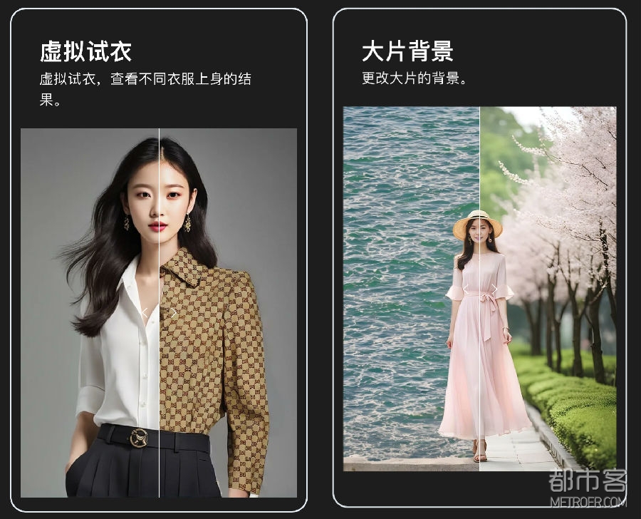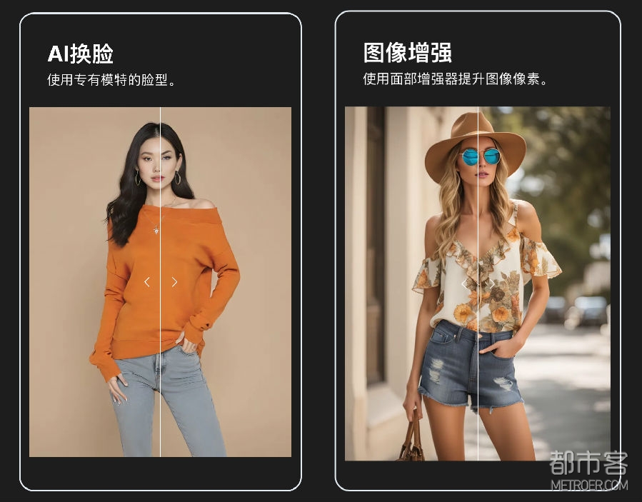 除此之外,DF 也提供 AI 辅助功能,图像增强,可以提供图像的分辨率(目前DF默认高清输出),放大图片,同时增强人脸的效果;AI 换脸,可以使用自己的脸型或者专有模特的脸型,选中的照片可以直接使用到市场推广或者在线商店;虚拟试衣,可以对比不同体型的模特,查看衣服上身的效果;大片背景,更换图片的背景,适应不同宣传场景的需要。