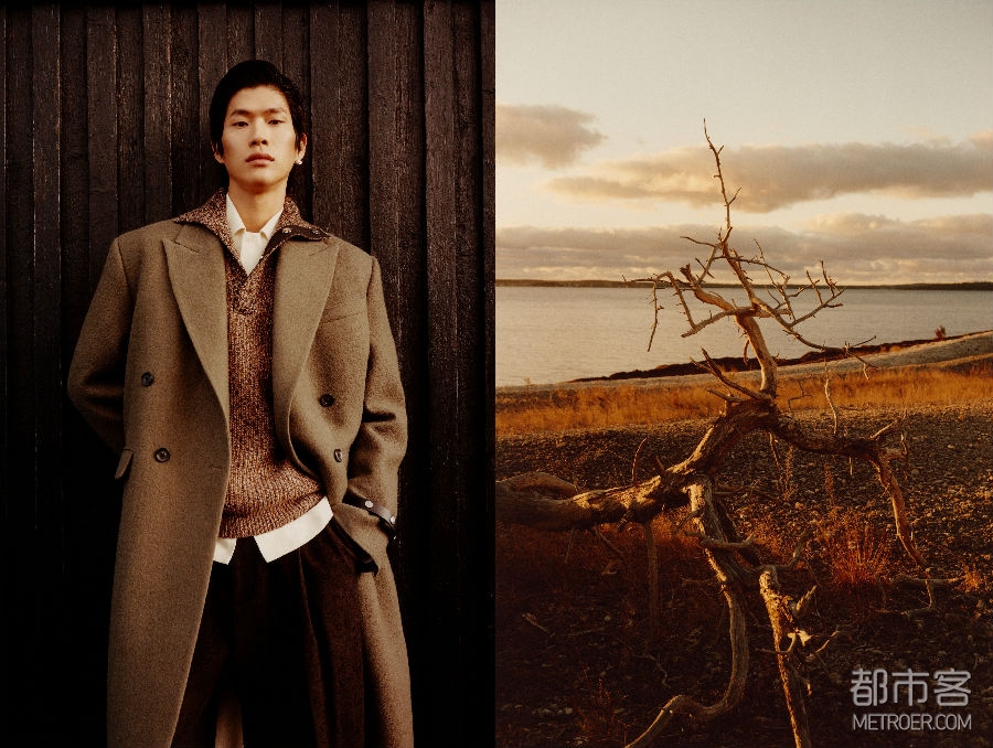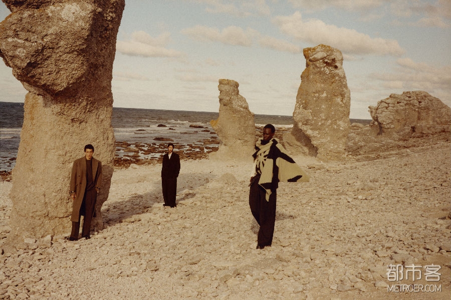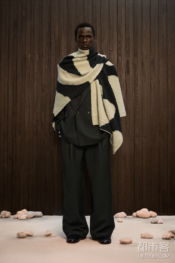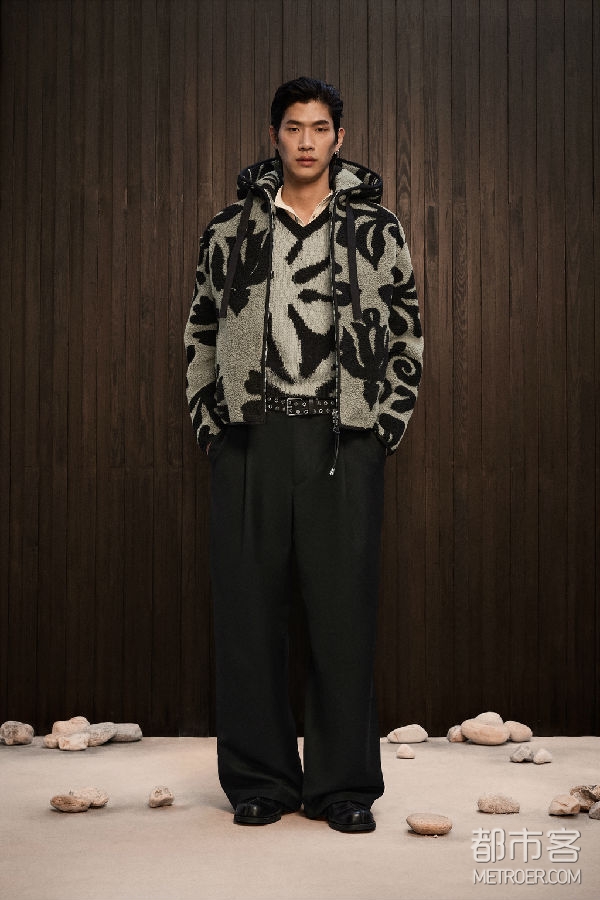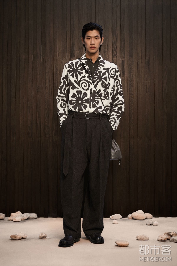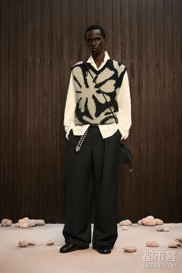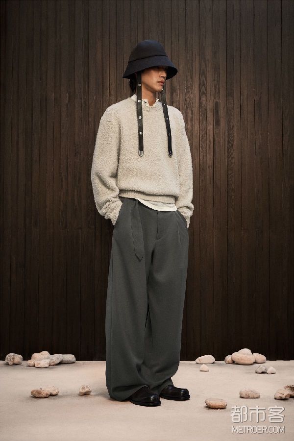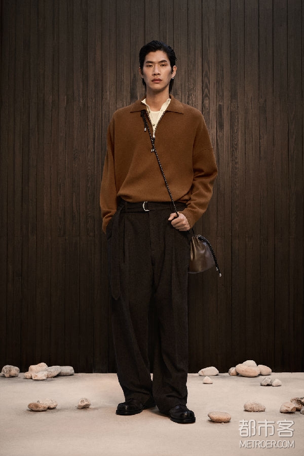 男装:剪裁合身的夹克设计得灵活又舒适,营造出一种放松且略宽松的轮廓。这些夹克可以与宽松的褶皱长裤、短裤和更直筒的长裤搭配,凸显灵活与触感。一件轮廓鲜明、肩部宽阔的羊毛大衣,领口采用了尖领设计,袖口处的皮革标签上镶嵌着凸纹的铆钉。这种金属质感的皮革装饰贯穿整个系列,从渔夫帽上的皮带到背包,及日常手袋上的皮带等。