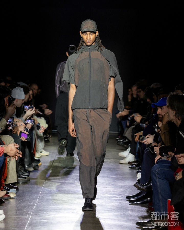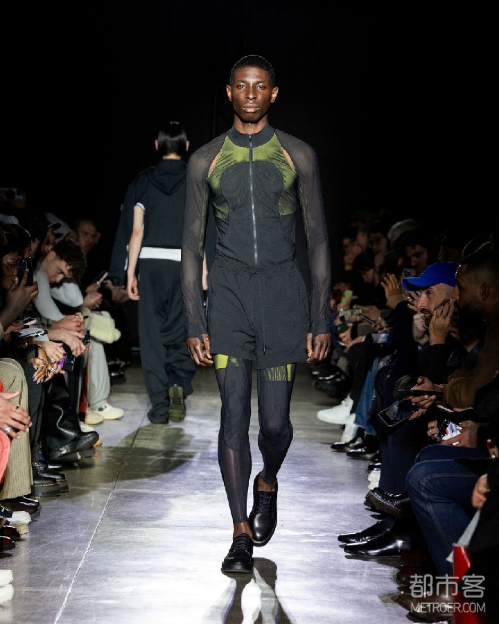 第三套Look为一套微透的网面面料运动服。上装这款连帽夹克别具巧思,袖子可拆卸变为短袖上衣,轻松实现一衣两穿,搭配同样材质的运动帽,更添时尚感。