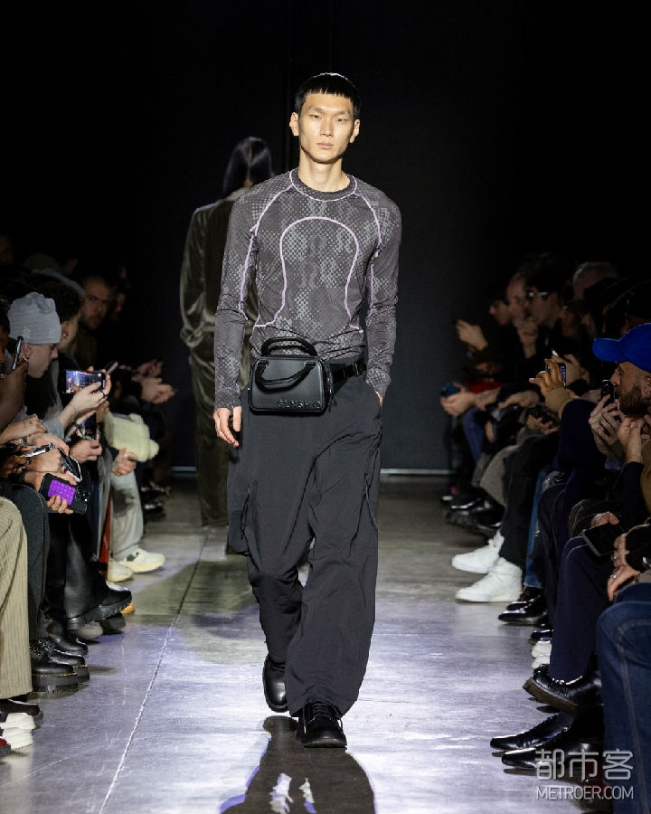 第二套Look选择采用限量版提花针织图案的紧身长袖T恤,浅粉色缝线打破了深色的沉闷。配饰则是点睛之笔,带有提手装饰的多用途人造革腰包,可随心打造多种摩登造型。
