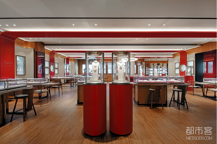 周大福全新形象店坐落于上海港汇恒隆广场二层,门店外观采用品牌标志性“周大福红”为主色调,延续融汇东方韵味与现代设计的美学理念。入口处品牌标识以经典设计,呼应品牌坚守的价值内核与视觉形象。