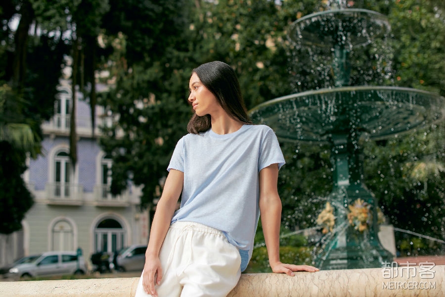 南法风情圆领T:柔滑垂感亚麻混纺面料,落肩版型搭配圆弧下摆,鸢尾蓝的澄澈为整体注入法式氛围;
