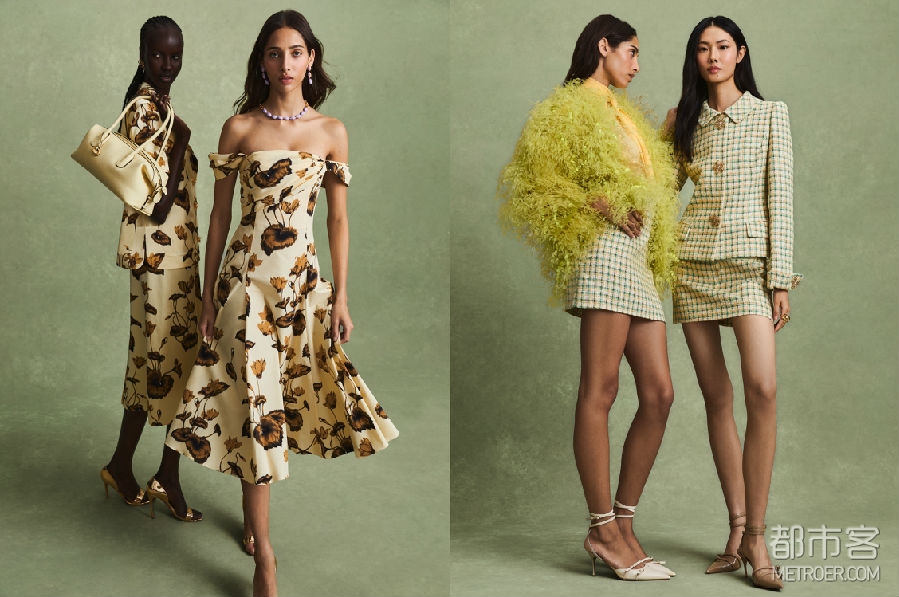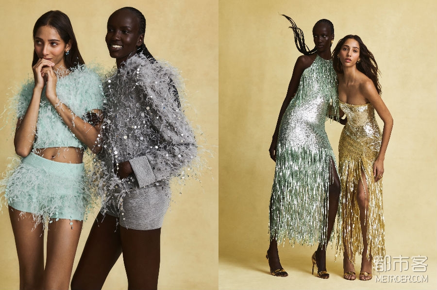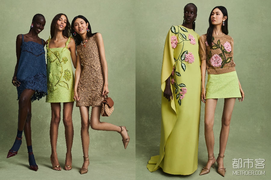 流苏元素贯穿系列,多次出现在设计之中——包括两款亮片及膝鸡尾酒礼服,以及一款饰有水晶格纹领口的管珠刺绣铂金色礼服。三款通体镶嵌水晶的晚装造型,展现出精湛的手工刺绣工艺。3D立体花束细节与与亮片藤蔓交织的羽毛元素相互呼应,为整体注入轻盈而愉悦的春日气息。