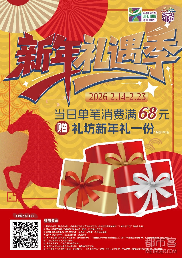 新春礼遇季,福礼也要“马上”到位!2月14日至2月23日,上滨生活广场开启“新年礼遇季”促销活动,当日单笔消费满68元赠礼坊新年礼一份。快来上滨,把心仪好物和满满福气一起带回家!