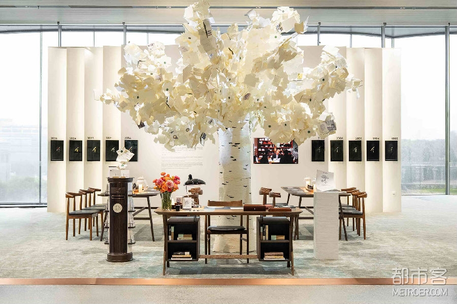 万宝龙“一笔万象”书写文化空间整体以书写为核心灵感,将品牌百年书写基因建构为沉浸式空间体验。步入此处,访客即刻徜徉在书写与文学交融的灵感氛围中,感受书写文化的独特魅力。展厅中央,由书籍、文字与诗歌构筑的“The Tree of Writing”静默而有力地俯瞰整个空间。这一由万宝龙与品牌长期合作伙伴Edinas Paper艺术工作室共同打造的大型创意艺术装置,将书页化作树叶,其上镌刻的灵感印记,凝练着文字的蓬勃生命力,让书写的精神力量直抵人心。