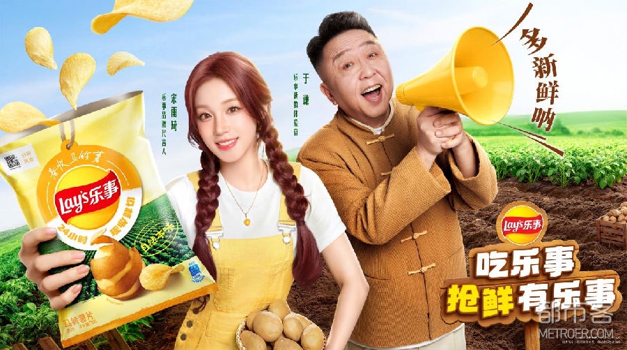 前不久,乐事官宣宋雨琦“入职”,成为品牌代言人。而后上线的广告片更是将新品传播成功打造成“教科书级别”。乐事通过简洁又巧妙的文案和差异化搭配的代言人策略,成功地深化产品“新鲜”心智。一句国民级别的口头禅“多新鲜呐”——大幅降低了品牌的沟通成本。而在合作明星的选择上,乐事更是深度锚定其背后的人设与 IP 内核:宋雨琦的青春活力与产品理念高度适配;作为乐事新鲜体验官的于谦则为广告注入轻松诙谐的氛围,二人鲜明的反差感让传播更具记忆点。