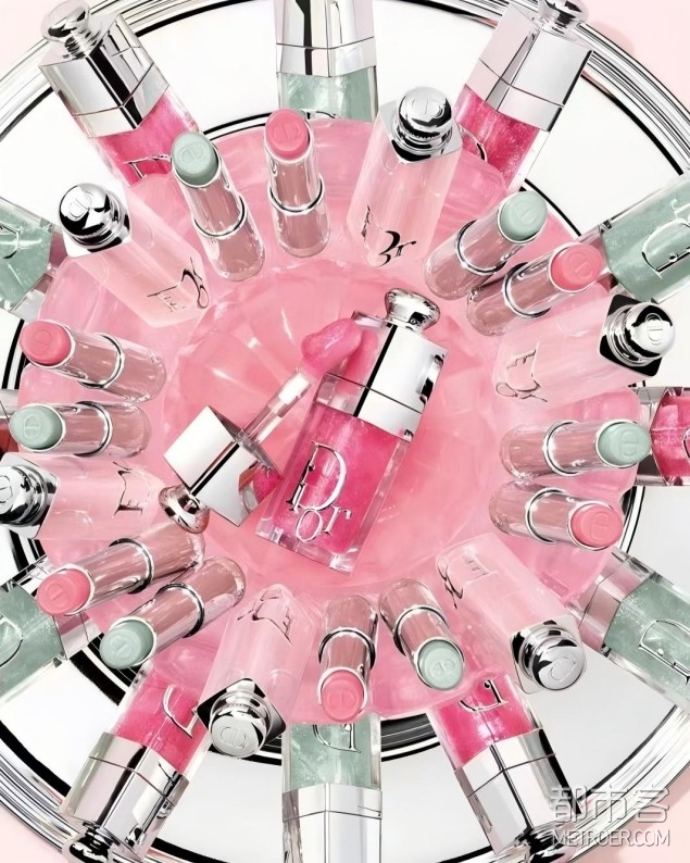 迪奥变色润唇膏——008软糖粉/086薄荷冰/041桃气橘/104车厘子四款限定色号,一抹焕现定制般春日明媚唇色。可叠涂全新迪奥魅惑润唇油打造春日氛围十足的3D玻璃唇妆效。