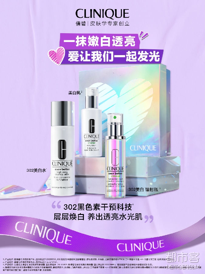 Clinique倩碧亮白「星」号礼盒呈献302美白「镭射瓶」、302美白水乳,有效美白淡斑,还原水光透亮,让自信魅力神采如同不灭星辰,定格在每一个爱意盛放的瞬间。