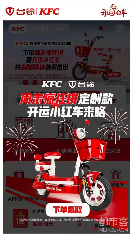 1月17日起,台铃与肯德基再度跨界合体,开启一波超强联名攻势。连续三周,下单「周末疯狂拼」套餐,即有机会抽取共计6000辆颜值爆表、好运拉满的联名开运小红车,让周末的每一餐都充满惊喜可能。